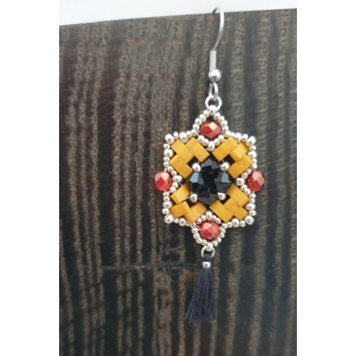 BOUCLE D OREILLE PENDANTE FORME CARRE MOUTARDE ET BRIQUE